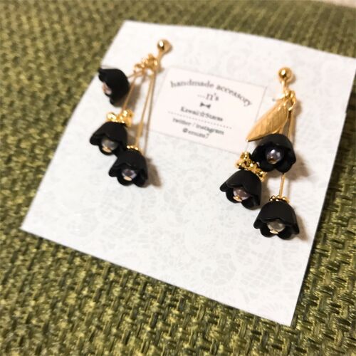 可愛いイヤリングが欲しい。ピアスを開ける勇気はない。すぐ落としてなくすけど、イヤリング派。 限定◆おめかし黒スズラン通販で人気の黒スズラン。#カワスタ 限定で、ガーリーにアレンジした仕様を出品します◎お花はゴールドのリボンで飾り付け、中にはラベ…