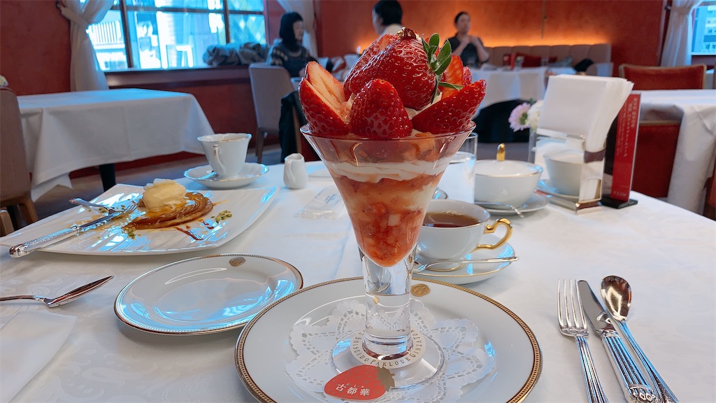 頂いたのは先のツイートにもある、「古都華」のロイヤルストロベリーパフェ。5,000円。高い。