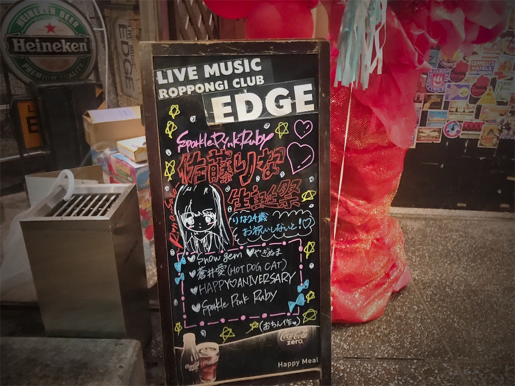 推しの佐藤りなちゃん(Sparkle Pink Ruby:通称スパピ)の生誕祭が六本木CLUB EDGEにて行われた。1ヶ月切った状態での告知だったのでどうなるかな〜って思いつつも、お客さんも結構来てて安心!有志の方々の素敵演出に客の私も勝手に心踊る。