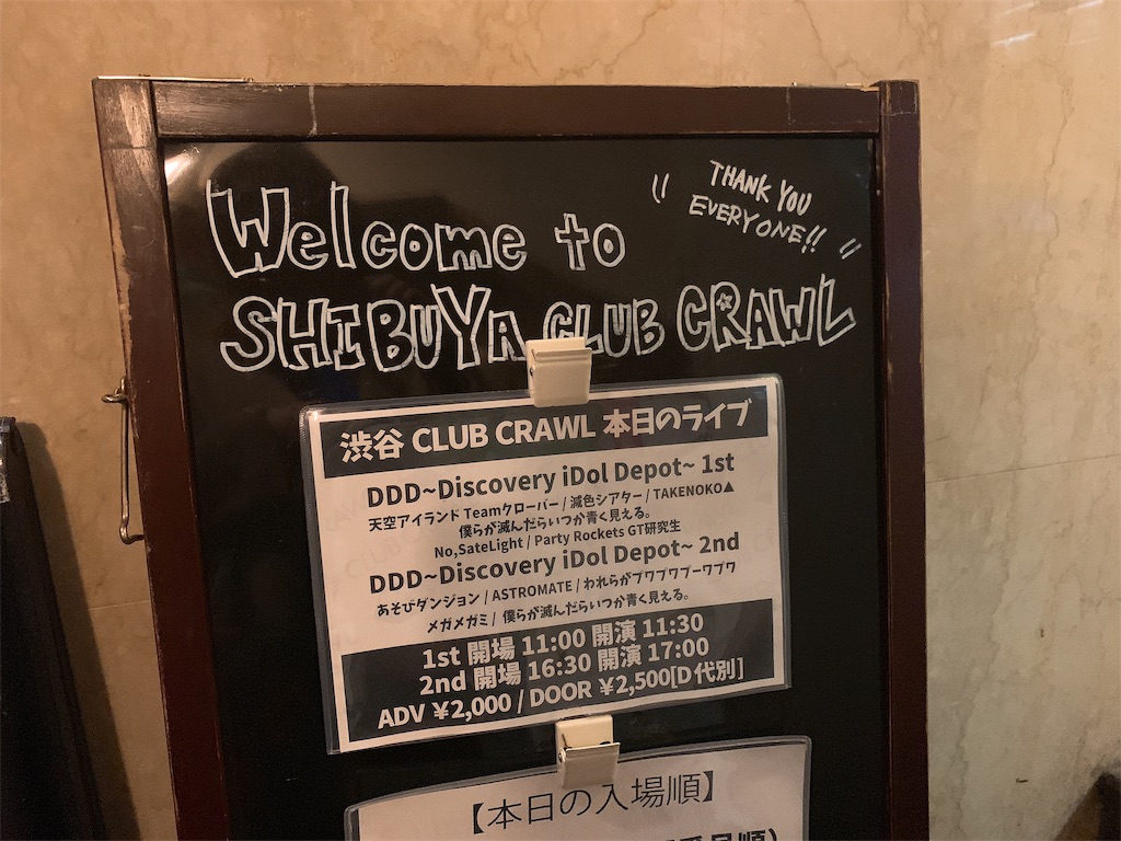 場所は、渋谷の並木橋の交差点を一個先にいったところにある、SHIBUYA CLUB CRAWL。今日はめずらしく当日券で入ったので、3000円超えだったんですが、マジですっごくよかった!われプワもなんだけど、前後のグループもマジで当たりだった!(18時に着いたため、前後のグループしか見れてないのですが…)